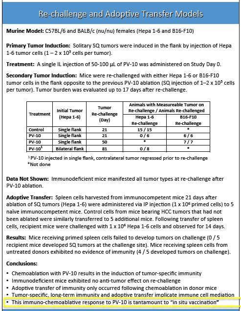 A key aspect of PV-10's clinical value proposition is the local effect of tumor ablation upon injection (the first of its dual mechanisms of action) that produces the systemic effect of a tumor-specific immune response and eventually anti-tumor immunity (the second mechanism).